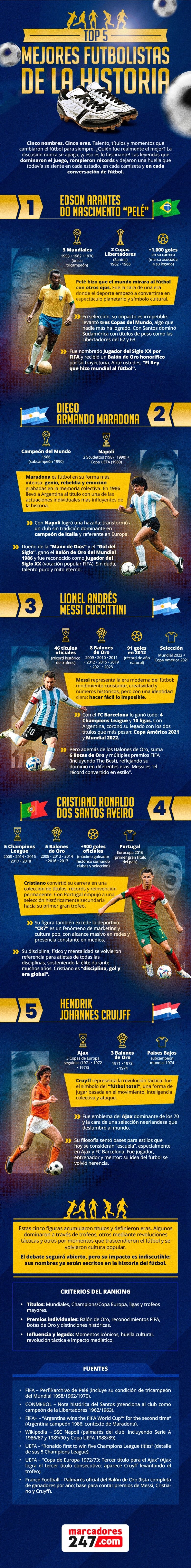 En ese cruce entre rendimiento e impacto aparecen cinco nombres que, con estilos y épocas distintas, se convirtieron en referencia permanente: Pelé, Diego Armando Maradona, Lionel Messi, Cristiano Ronaldo y Johan Cruyff.
